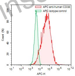 Flow-cytometry using APC anti-human CD38 antibody. RPMI-8226 cells were stained with an irrelevant antibody (Green Histogram) or an APC anti-human CD38 antibody monoclonal antibody (Catalog # HB691337, Red Histogram) at a concentration of 5 µg/ml for 30 mins at RT. After washing, cells analysed on a NovoCyte Flow Cytometer. |