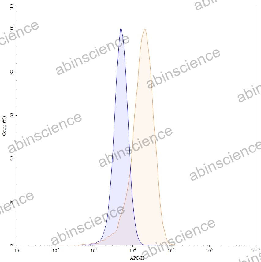 Flow-cytometry using APC anti-human CD30 antibody. Jurkat cells were stained with an irrelevant antibody (Blue Histogram) or an APC anti-human CD30 monoclonal antibody (Catalog: HB038237, Yellow Histogram) at a concentration of 5 µg/ml for 30 mins at RT. After washing, cells analysed on a NovoCyte Flow Cytometer. |