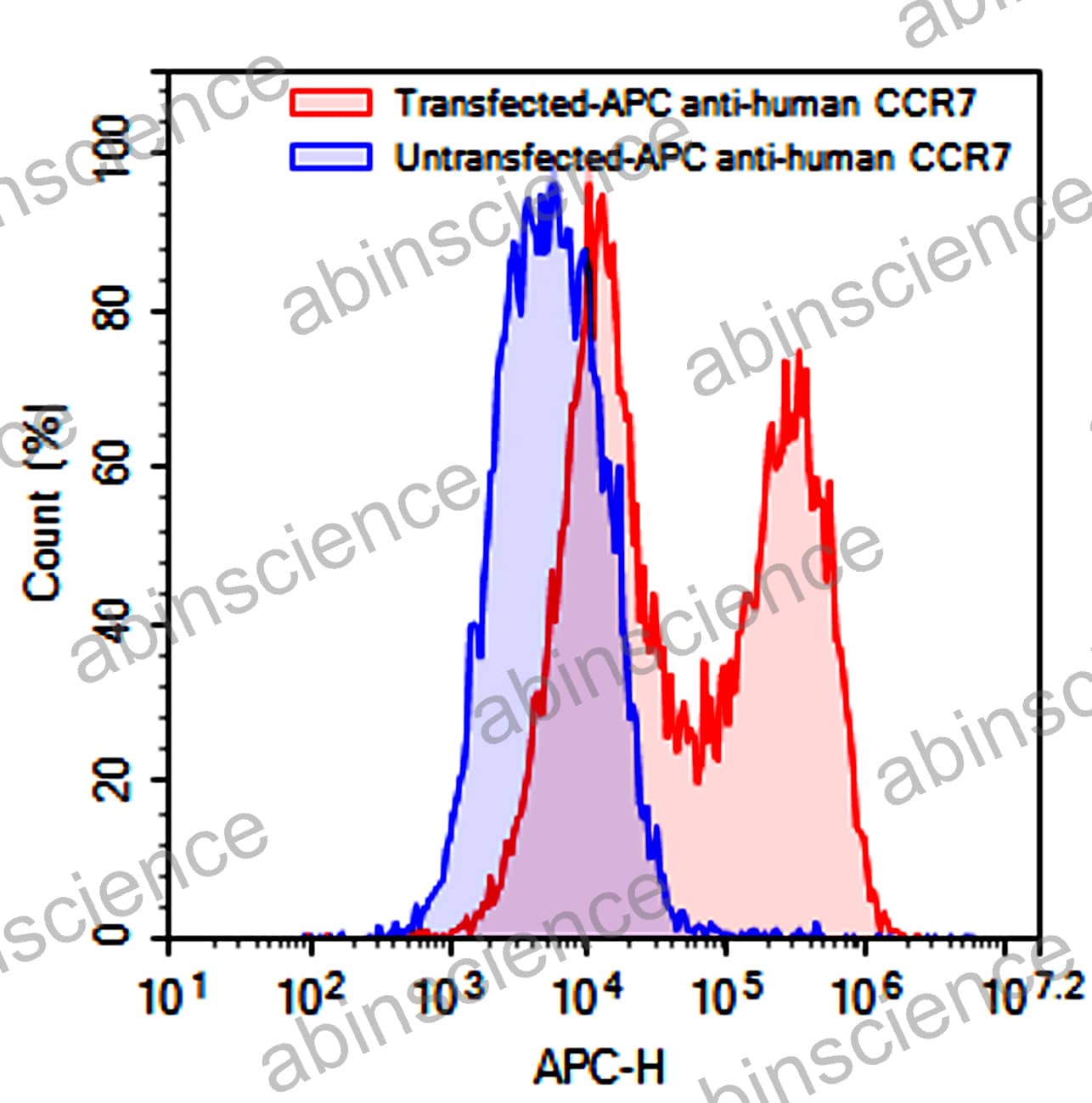 Flow-cytometry using APC anti-human CCR7 antibody. Untransfected (Blue Histogram) or Transfected 293T cells (Red Histogram) were fixed and permeabilized, then stained with an APC anti-human CCR7 antibody monoclonal antibody (Catalog # HB053137) at a concentration of 5 µg/ml for 30 mins at RT. After washing, cells analysed on a NovoCyte Flow Cytometer.