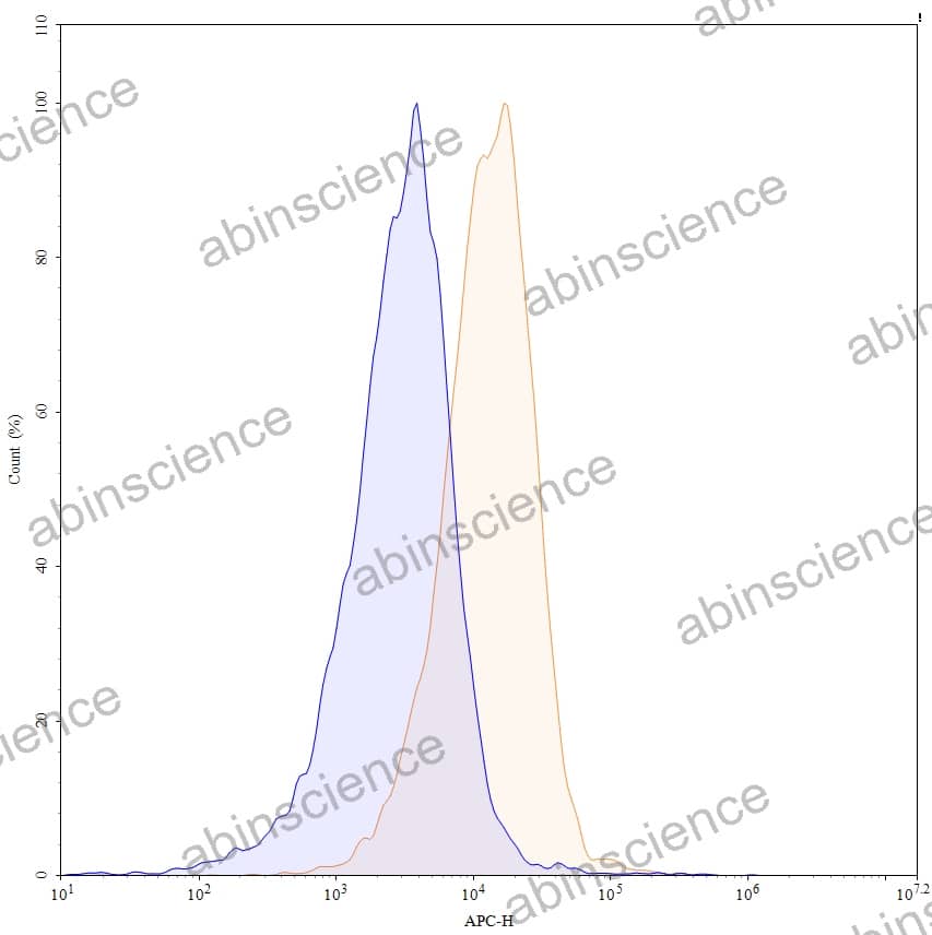 Flow-cytometry APC using anti-human CD183 antibody. Untransfected cells (blue Histogram) and Transfected cells (Yellow Histogram) were stained with an APC anti-human CD183 monoclonal antibody (Catalog: HW606137) at a concentration of 5 µg/ml for 30 mins at RT. After washing, cells analysed on a NovoCyte Flow Cytometer. |