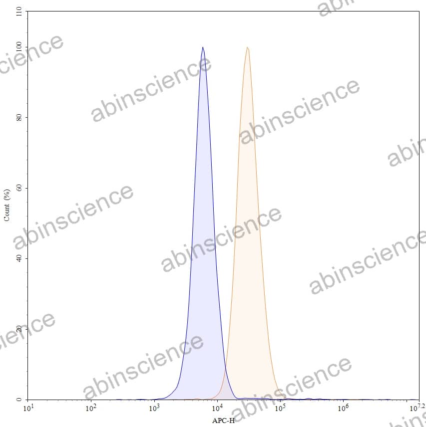 Flow-cytometry using APC anti-human CD172a antibody. U937 cells were stained with an irrelevant antibody (Blue Histogram) or an APC anti-human CD172a monoclonal antibody (Catalog: HX892137, Yellow Histogram) at a concentration of 5 µg/ml for 30 mins at RT. After washing, and cells analysed on a NovoCyte Flow Cytometer. |