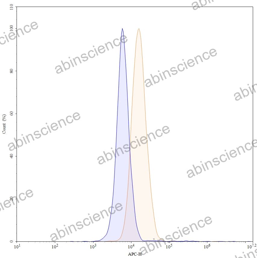 Flow-cytometry using APC anti-human CD172a antibody. U937 cells were stained with an irrelevant antibody (Blue Histogram) or an APC anti-human CD172a monoclonal antibody (Catalog: HX892237, Yellow Histogram) at a concentration of 5 µg/ml for 30 mins at RT. After washing, and cells analysed on a NovoCyte Flow Cytometer. |