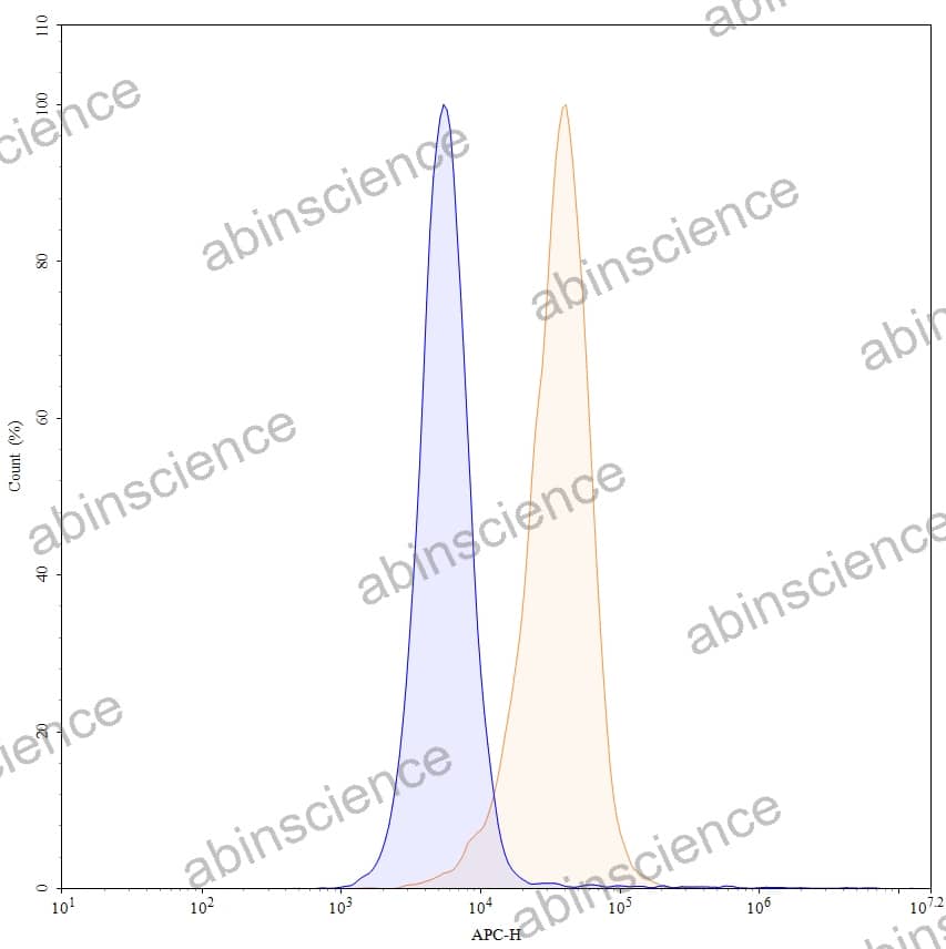 Flow-cytometry using APC anti-human CD157 antibody. THP-1 cells were stained with an irrelevant antibody (Blue Histogram) or an APC anti-human CD157 monoclonal antibody (Catalog: HC654137, Yellow Histogram) at a concentration of 5 µg/ml for 30 mins at RT. After washing, and cells analysed on a NovoCyte Flow Cytometer. |