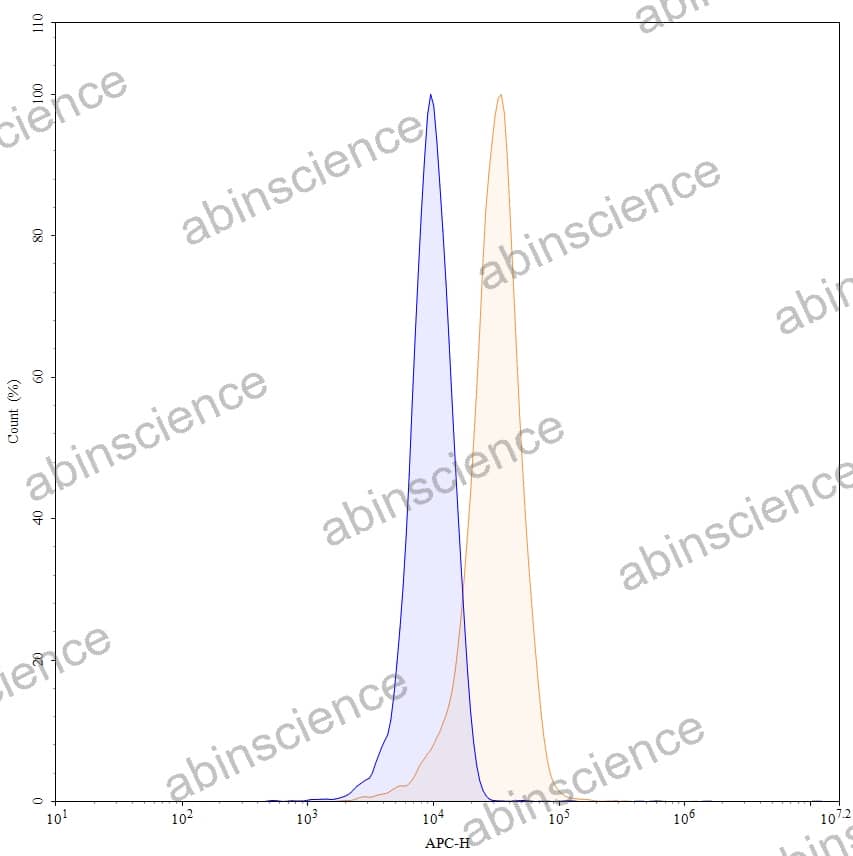 Flow-cytometry using APC anti-human ANGPT2 antibody. HUVEC cells were fixed and permeabilized, then stained with an irrelevant antibody (Blue Histogram) or an APC anti-human ANGPT2 monoclonal antibody (Catalog: HC281137, Yellow Histogram) at a concentration of 5 µg/ml for 30 mins at RT. After washing, cells analysed on a NovoCyte Flow Cytometer. |