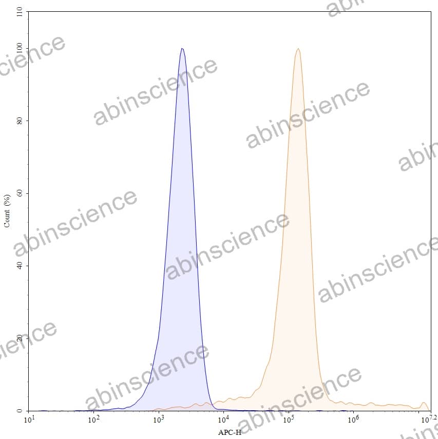 Flow-cytometry using APC anti-human CD162 antibody. Jurkat cells were stained with an irrelevant antibody (Blue Histogram) or an APC anti-human CD162 monoclonal antibody (Catalog: HC298137, Yellow Histogram) at a concentration of 5 µg/ml for 30 mins at RT. After washing, and cells analysed on a NovoCyte Flow Cytometer. |
