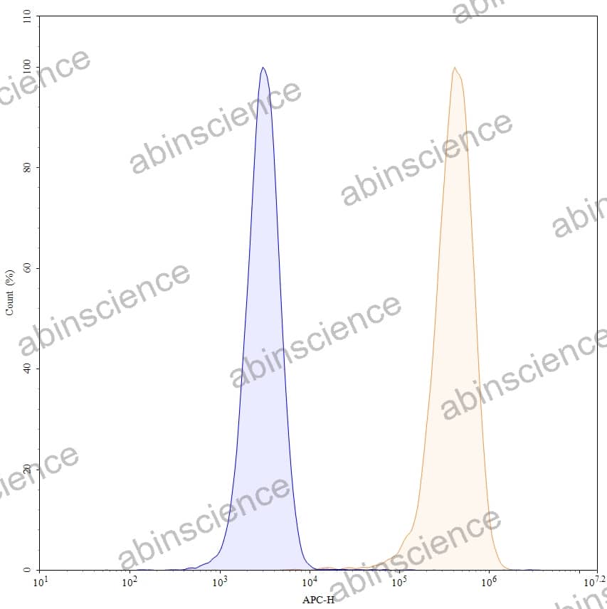 Flow-cytometry using APC anti-human CD93 antibody. U937 cells were stained with an irrelevant antibody (Blue Histogram) or an APC anti-human CD93 monoclonal antibody (Catalog: HV345137, Yellow Histogram) at a concentration of 5 µg/ml for 30 mins at RT. After washing, cells analysed on a NovoCyte Flow Cytometer. |