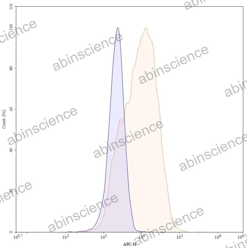 Flow-cytometry using APC anti-human CD278 antibody. MOLT-4 cells were stained with an irrelevant antibody (Blue Histogram) or an APC anti-human CD278 monoclonal antibody (Catalog: HV702137, Yellow Histogram) at a concentration of 5 µg/ml for 30 mins at RT. After washing, cells analysed on a NovoCyte Flow Cytometer. |