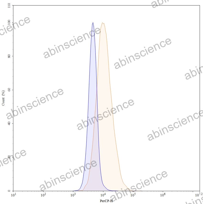 Flow-cytometry using PerCP anti-human CD15 antibody. THP-1 cells were fixed and permeabilized, then stained with an irrelevant antibody (Blue Histogram) or an PerCP anti-human CD15 monoclonal antibody (Catalog: HB132147, Yellow Histogram) at a concentration of 5 µg/ml for 30 mins at RT. After washing, and cells analysed on a NovoCyte Flow Cytometer. |