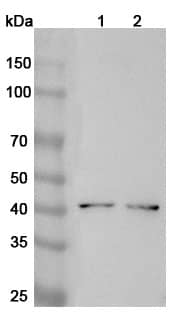 Western blot analysis was performed using anti-AIM2 polyclonal antibody at 1ug/mL on various samples. Lane 1: A431 cell lysate Lane 2: Jurkat cell lysate