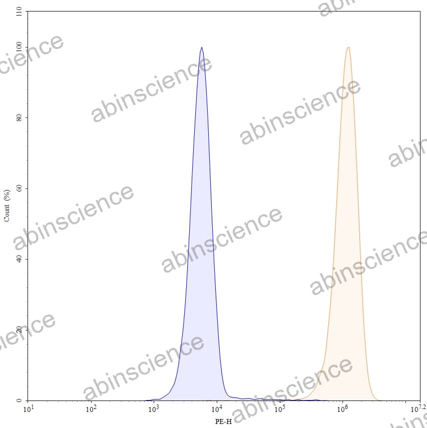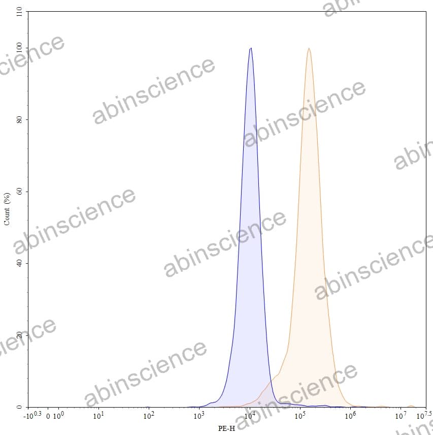 Flow-cytometry using PE anti-human EGFR antibody. A431 cells were stained with an irrelevant antibody (Blue Histogram) or an PE anti-human EGFR monoclonal antibody (Catalog: HF004327, Yellow Histogram) at a concentration of 5 µg/ml for 30 mins at RT. After washing, and cells analysed on a NovoCyte Flow Cytometer. |