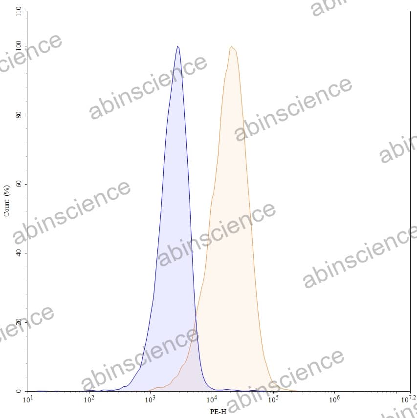 Flow-cytometry using PE anti-human CD71 antibody. U937 cells were stained with an irrelevant antibody (Blue Histogram) or an PE anti-human CD71 monoclonal antibody (Catalog: HY036127, Yellow Histogram) at a concentration of 5 µg/ml for 30 mins at RT. After washing, cells analysed on a NovoCyte Flow Cytometer. |