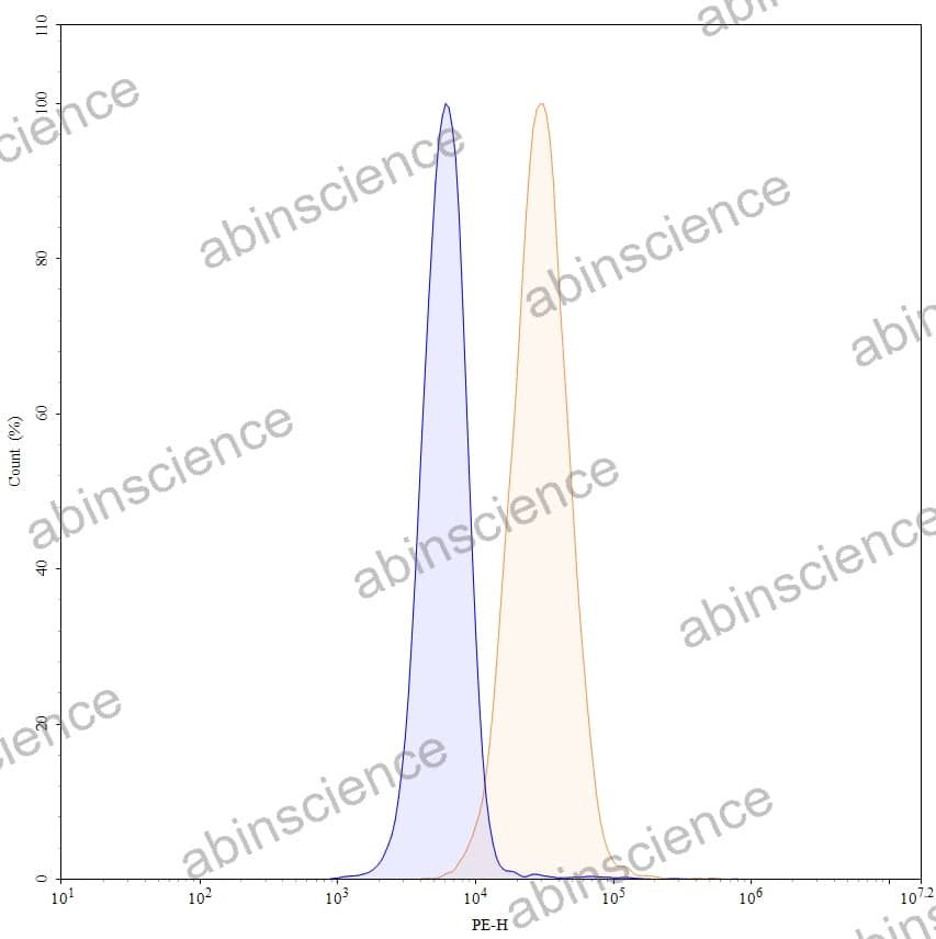 Flow-cytometry using PE anti-human CD220 antibody. MCF-7 cells were stained with an irrelevant antibody (Blue Histogram) or an PE anti-human CD220 monoclonal antibody (Catalog: HY112127, Yellow Histogram) at a concentration of 5 µg/ml for 30 mins at RT. After washing, and cells analysed on a NovoCyte Flow Cytometer. |