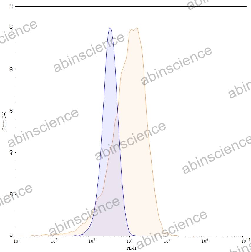 Flow-cytometry using PE anti-human MAPT antibody. HDLM-2 cells were stained with an irrelevant antibody (Blue Histogram) or an PE anti-human MAPT monoclonal antibody (Catalog: HY086127, Yellow Histogram) at a concentration of 5 µg/ml for 30 mins at RT. After washing, cells analysed on a NovoCyte Flow Cytometer. |
