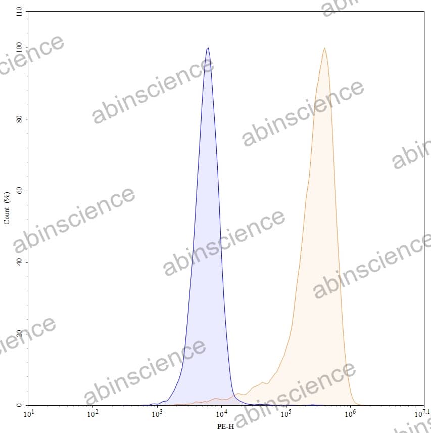 Flow-cytometry using PE anti-human FOLR1 antibody. Hela cells were stained with an irrelevant antibody (Blue Histogram) or an PE anti-human FOLR1 monoclonal antibody (Catalog: HB825227, Yellow Histogram) at a concentration of 5 µg/ml for 30 mins at RT. After washing, cells analysed on a NovoCyte Flow Cytometer. |