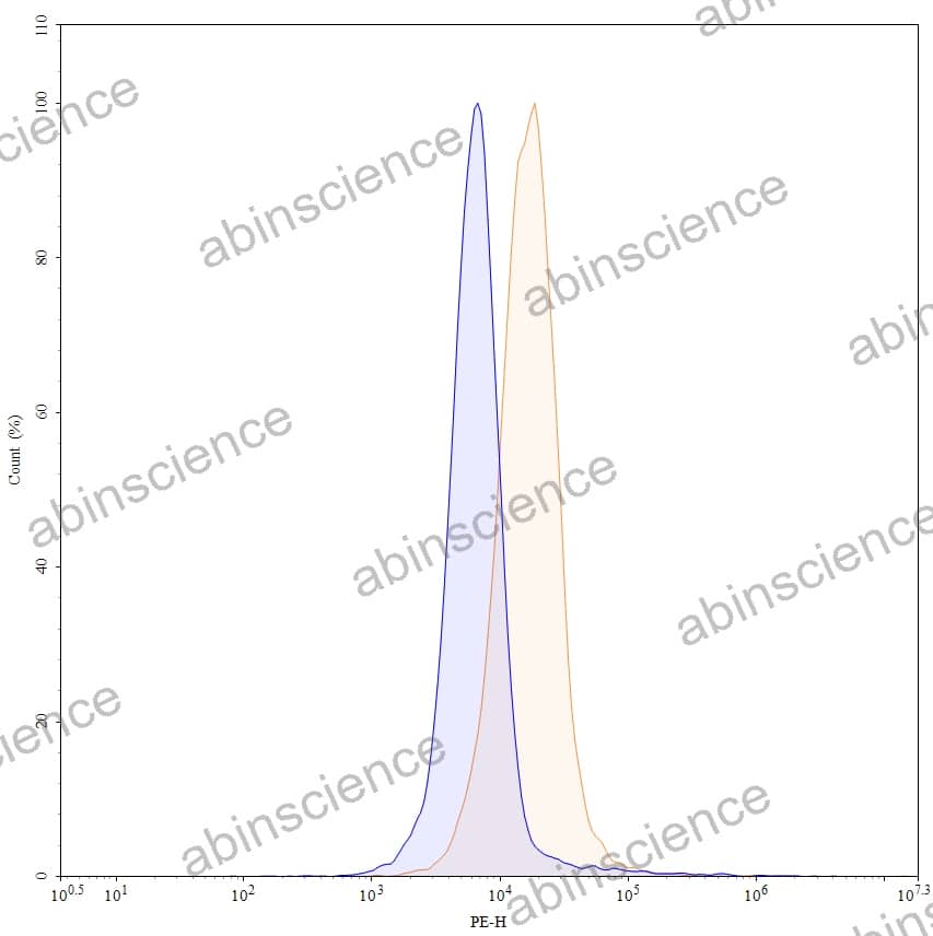 Flow-cytometry using PE anti-human CD105 antibody. Hela cells were stained with an irrelevant antibody (Blue Histogram) or an PE anti-human CD105 monoclonal antibody (Catalog: HB604127, Yellow Histogram) at a concentration of 5 µg/ml for 30 mins at RT. After washing, and cells analysed on a NovoCyte Flow Cytometer. |
