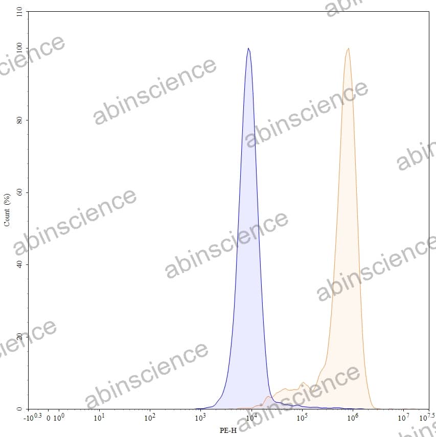 Flow-cytometry using PE anti-human CD49c antibody. Hela cells were stained with an irrelevant antibody (Blue Histogram) or an PE anti-human CD49c monoclonal antibody (Catalog: HB114127, Yellow Histogram) at a concentration of 5 µg/ml for 30 mins at RT. After washing, and cells analysed on a NovoCyte Flow Cytometer. |
