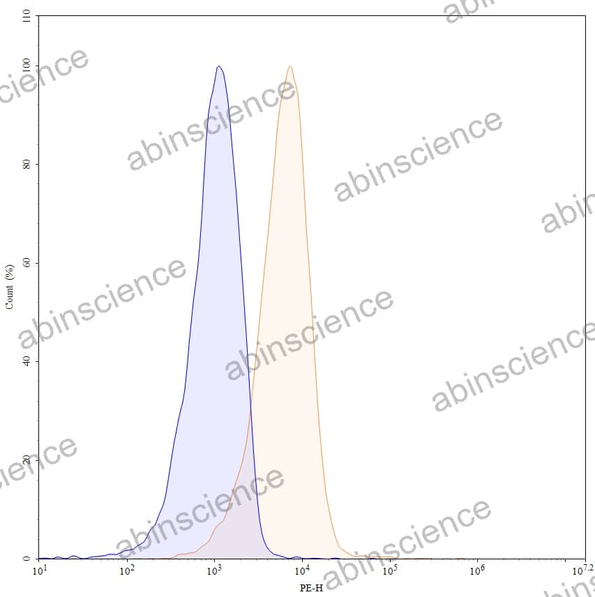 Flow-cytometry using PE anti-human CD30 antibody. Jurkat cells were stained with an irrelevant antibody (Blue Histogram) or an PE anti-human CD30 monoclonal antibody (Catalog: HB038227, Yellow Histogram) at a concentration of 5 µg/ml for 30 mins at RT. After washing, cells analysed on a NovoCyte Flow Cytometer. |