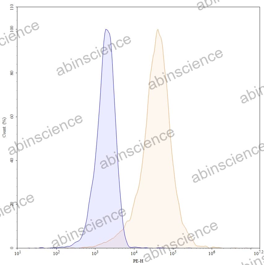 Flow-cytometry using PE anti-human CD30 antibody. Jurkat cells were stained with an irrelevant antibody (Blue Histogram) or an PE anti-human CD30 monoclonal antibody (Catalog: HB038427, Yellow Histogram) at a concentration of 5 µg/ml for 30 mins at RT. After washing, and cells analysed on a NovoCyte Flow Cytometer. |