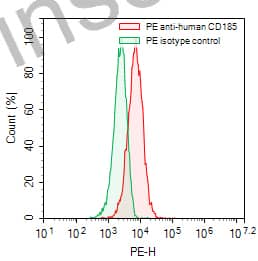 Flow-cytometry using PE anti-human CD185(CXCR5) antibody. Raji cells were stained with an irrelevant antibody (Green Histogram) or a PE anti-human CD185(CXCR5) antibody monoclonal antibody (Catalog # HB160127, Red Histogram) at a concentration of 5 µg/ml for 30 mins at RT. After washing, cells analysed on a NovoCyte Flow Cytometer. |