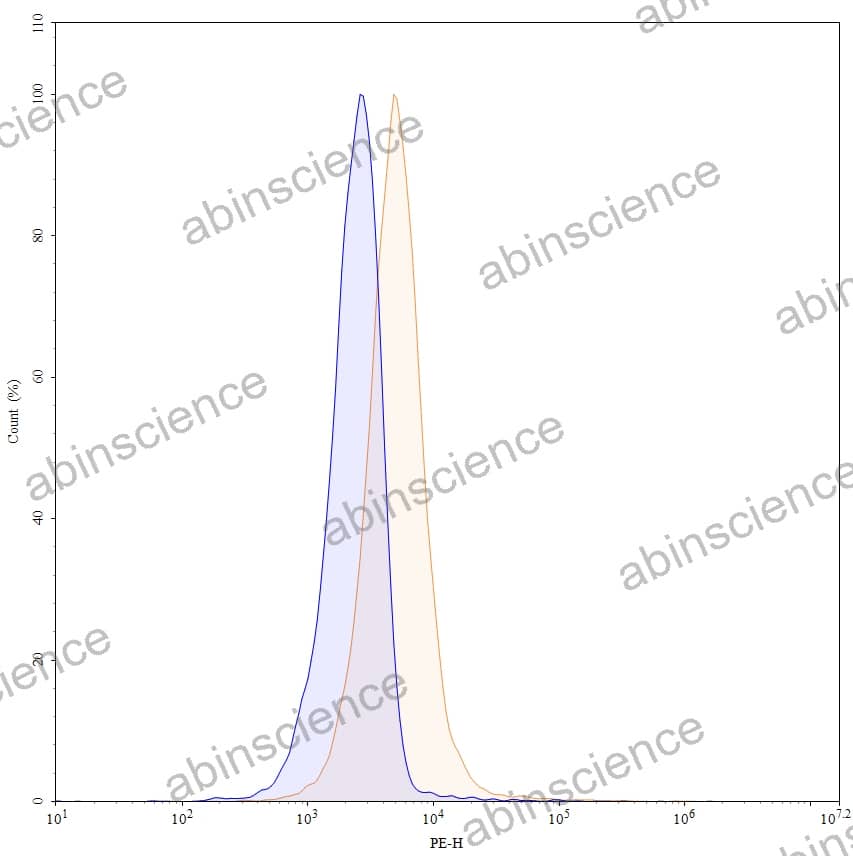 Flow-cytometry using PE anti-human CD185 antibody. Raji cells were stained with an irrelevant antibody (Blue Histogram) or an PE anti-human CD185 monoclonal antibody (Catalog: HB160127, Yellow Histogram) at a concentration of 5 µg/ml for 30 mins at RT. After washing, cells analysed on a NovoCyte Flow Cytometer. |