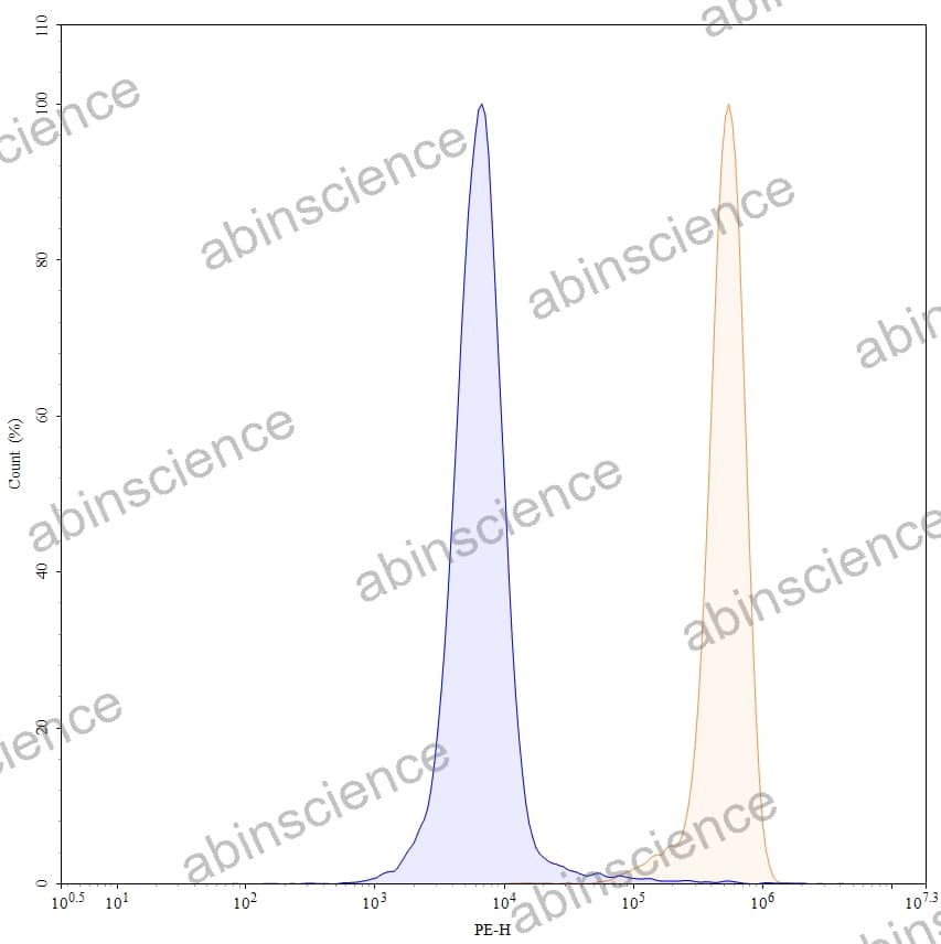 Flow-cytometry using PE anti-human CD147 antibody. Hela cells were stained with an irrelevant antibody (Blue Histogram) or an PE anti-human CD147 monoclonal antibody (Catalog: HW664127, Yellow Histogram) at a concentration of 5 µg/ml for 30 mins at RT. After washing, and cells analysed on a NovoCyte Flow Cytometer. |