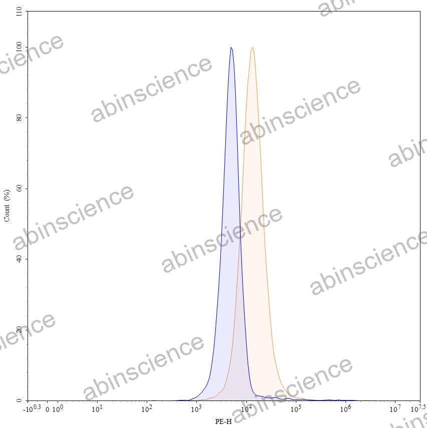 Flow-cytometry using PE anti-human CXCR4 antibody. Hela cells were stained with an irrelevant antibody (Blue Histogram) or an PE anti-human CXCR4 monoclonal antibody (Catalog: HX206127, Yellow Histogram) at a concentration of 5 µg/ml for 30 mins at RT. After washing, and cells analysed on a NovoCyte Flow Cytometer. |