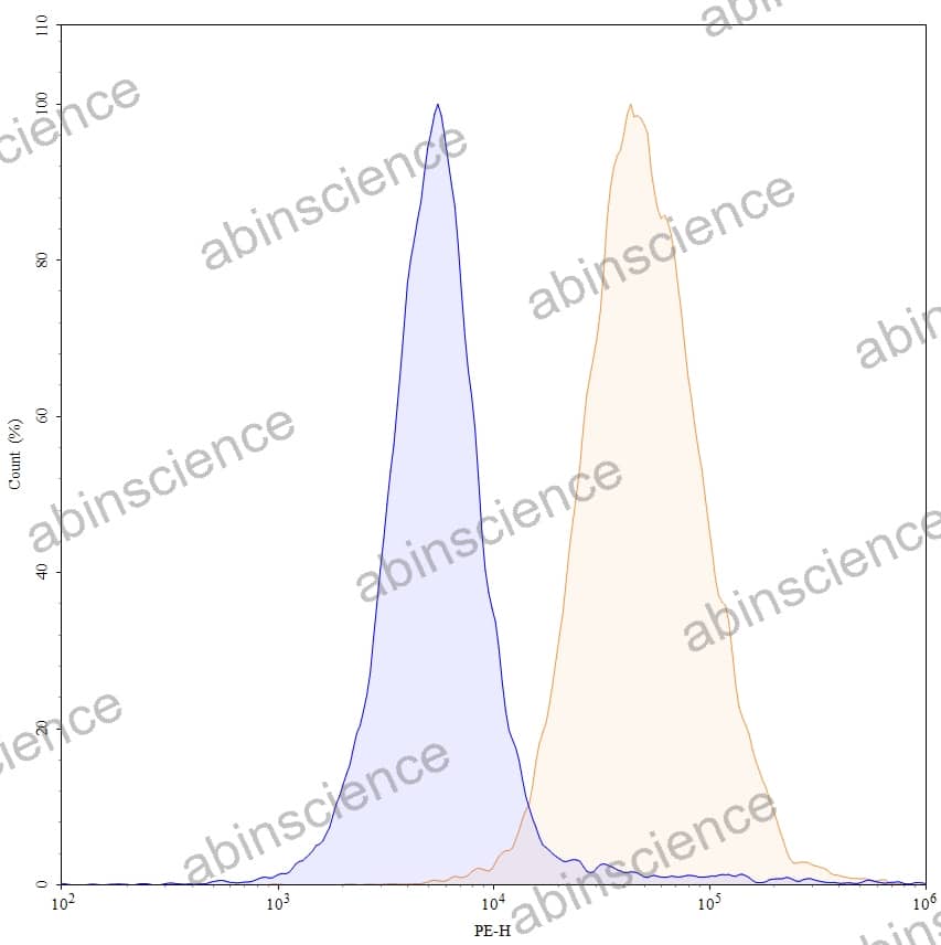 Flow-cytometry using PE anti-human CD339 antibody. HepG-2 cells were stained with an irrelevant antibody (Blue Histogram) or an PE anti-human CD339 monoclonal antibody (Catalog: HX118127, Yellow Histogram) at a concentration of 5 µg/ml for 30 mins at RT. After washing, and cells analysed on a NovoCyte Flow Cytometer. |