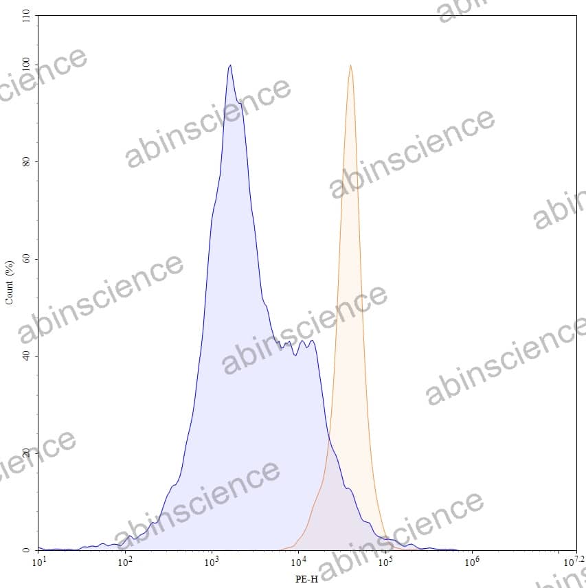 Flow-cytometry using PE anti-Mouse CD47 antibody. Mouse spleen cells were stained with an irrelevant antibody (Blue Histogram) or an PE anti-Mouse CD47 monoclonal antibody (Catalog: MC359127, Yellow Histogram) at a concentration of 5 µg/ml for 30 mins at RT. After washing, cells analysed on a NovoCyte Flow Cytometer. |