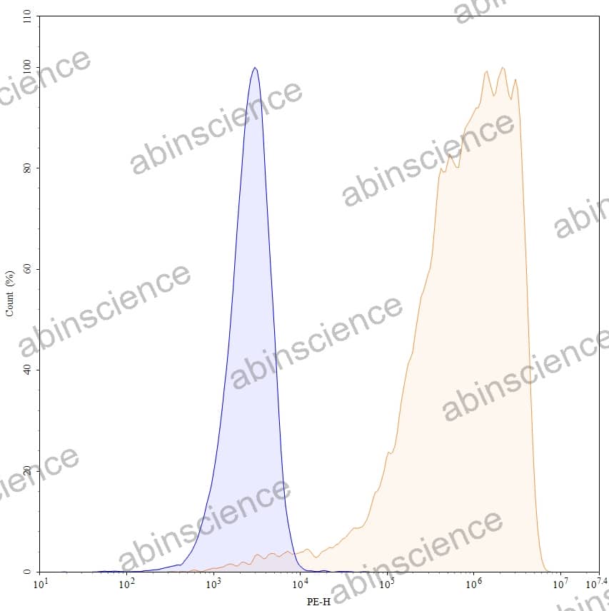 Flow-cytometry using PE anti-human CD162 antibody. Jurkat cells were stained with an irrelevant antibody (Blue Histogram) or an PE anti-human CD162 monoclonal antibody (Catalog: HC298127, Yellow Histogram) at a concentration of 5 µg/ml for 30 mins at RT. After washing, and cells analysed on a NovoCyte Flow Cytometer. |