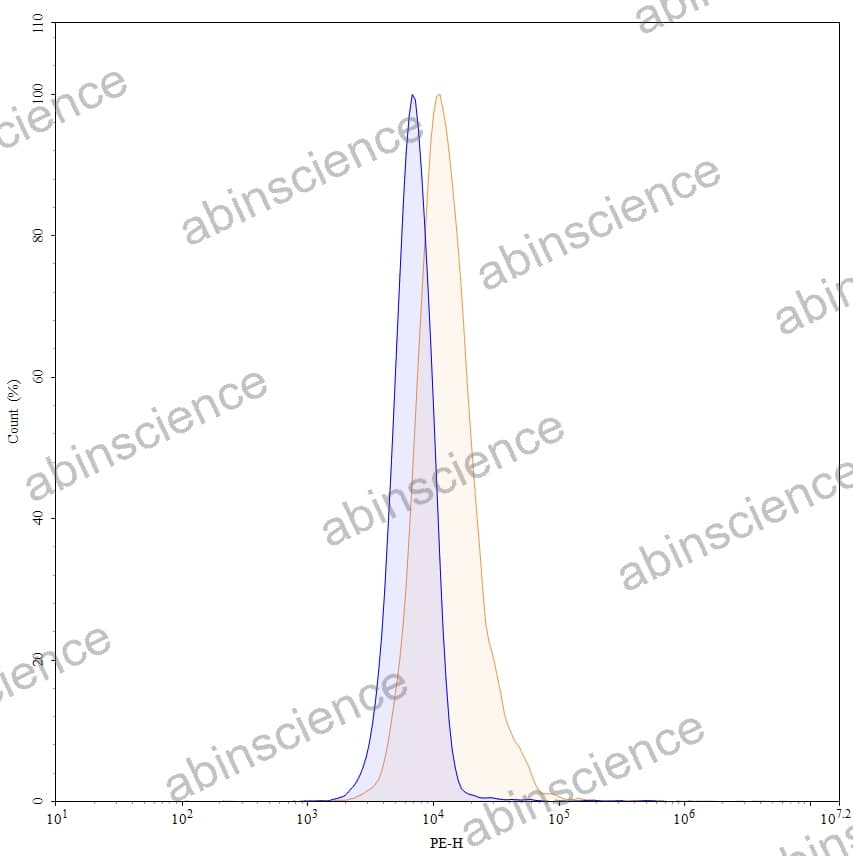 Flow-cytometry using PE anti-human IL31RA antibody. U87 cells were stained with an irrelevant antibody (Blue Histogram) or an PE anti-human IL31RA monoclonal antibody (Catalog: HV121127, Yellow Histogram) at a concentration of 5 µg/ml for 30 mins at RT. After washing, and cells analysed on a NovoCyte Flow Cytometer. |