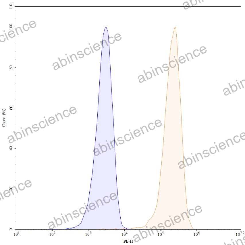 Flow-cytometry using PE anti-human CD93 antibody. U937 cells were stained with an irrelevant antibody (Blue Histogram) or an PE anti-human CD93 monoclonal antibody (Catalog: HV345127, Yellow Histogram) at a concentration of 5 µg/ml for 30 mins at RT. After washing, cells analysed on a NovoCyte Flow Cytometer. |