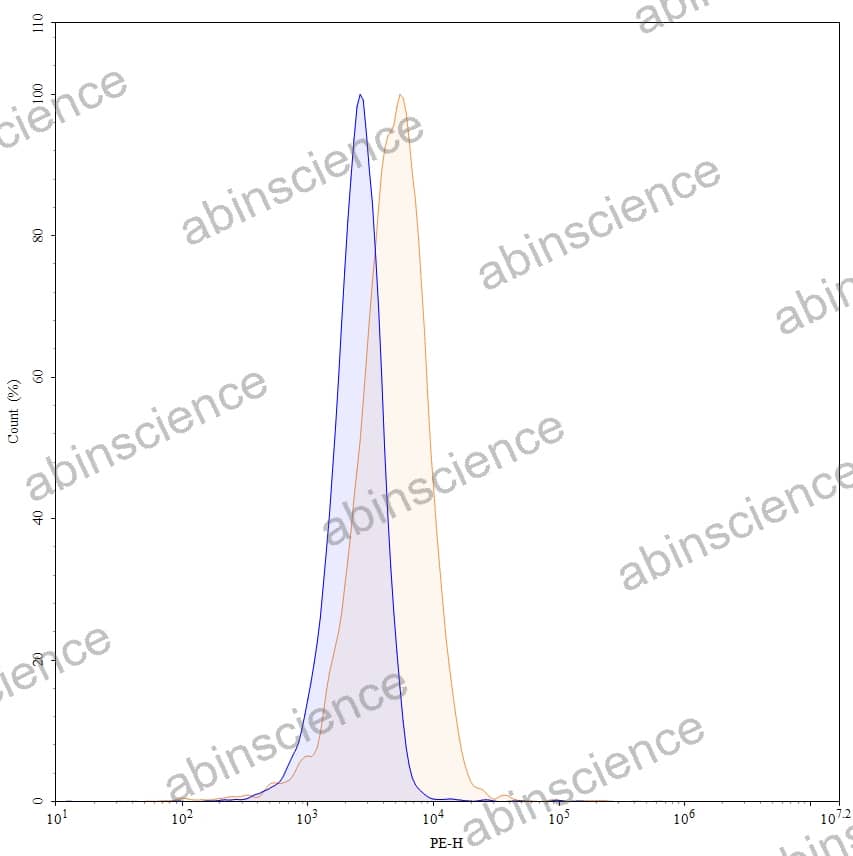Flow-cytometry using PE anti-human CD93 antibody. U937 cells were stained with an irrelevant antibody (Blue Histogram) or an PE anti-human CD93 monoclonal antibody (Catalog: HV345227, Yellow Histogram) at a concentration of 5 µg/ml for 30 mins at RT. After washing, and cells analysed on a NovoCyte Flow Cytometer. |