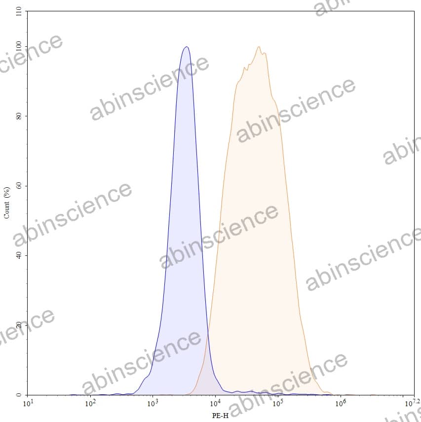 Flow-cytometry using PE anti-human CD344 antibody. HepG-2 cells were stained with an irrelevant antibody (Blue Histogram) or an PE anti-human CD344 monoclonal antibody (Catalog: HV376127, Yellow Histogram) at a concentration of 5 µg/ml for 30 mins at RT. After washing, and cells analysed on a NovoCyte Flow Cytometer. |
