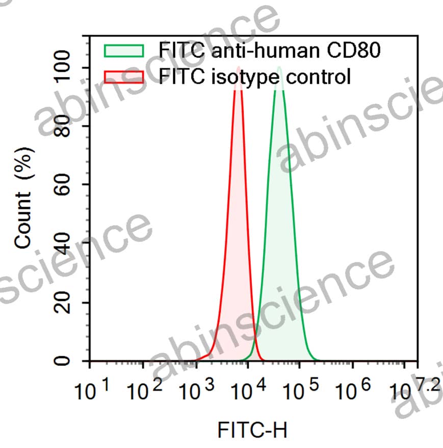 Flow-cytometry using FITC anti-Human CD80 antibody. Raji cells were stained with an irrelevant antibody (Red Histogram) or a FITC anti-Human CD80 antibody monoclonal antibody (Catalog # HW630217 , Green Histogram) at a concentration of 5 µg/ml for 30 mins at RT. After washing, cells analysed on a NovoCyte Flow Cytometer. |