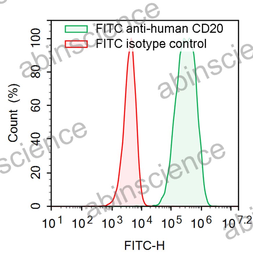 Flow-cytometry using FITC anti-Human CD20 antibody. Daudi cells were stained with an irrelevant antibody (Red Histogram) or a FITC anti-Human CD20 antibody monoclonal antibody (Catalog # HY257517 , Green Histogram) at a concentration of 5 µg/ml for 30 mins at RT. After washing, cells analysed on a NovoCyte Flow Cytometer. |