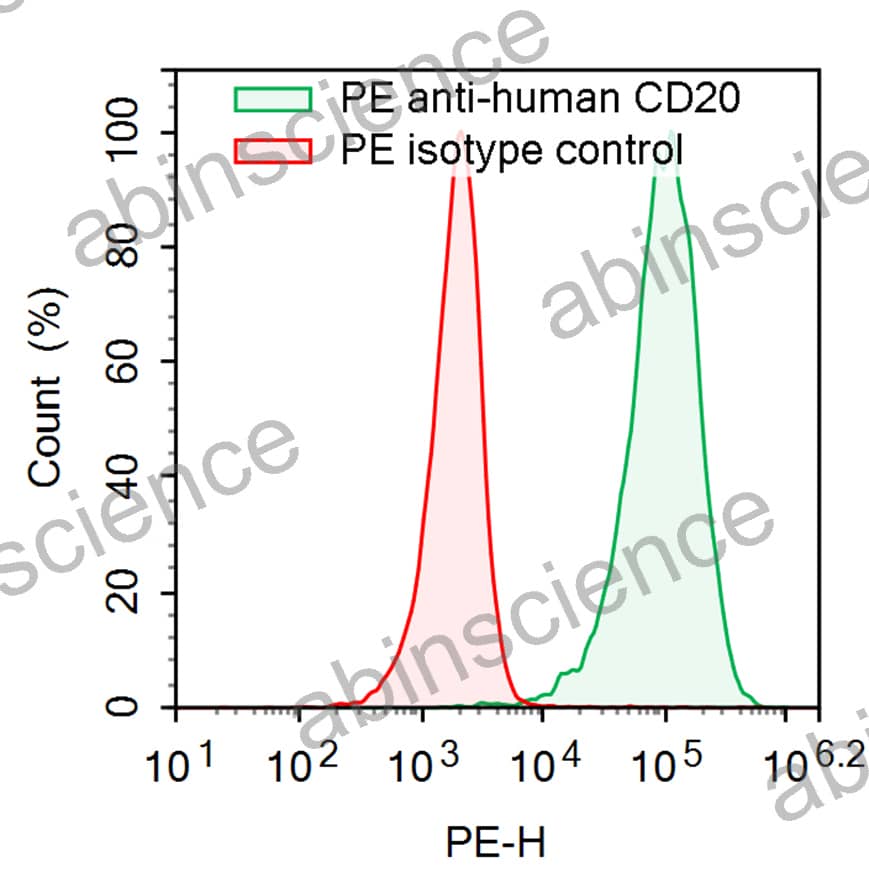 Flow-cytometry using PE anti-Human CD20 antibody. Daudi cells were stained with an irrelevant antibody (Red Histogram) or a PE anti-Human CD20 antibody monoclonal antibody (Catalog # HY257527 , Green Histogram) at a concentration of 5 µg/ml for 30 mins at RT. After washing, cells analysed on a NovoCyte Flow Cytometer. |