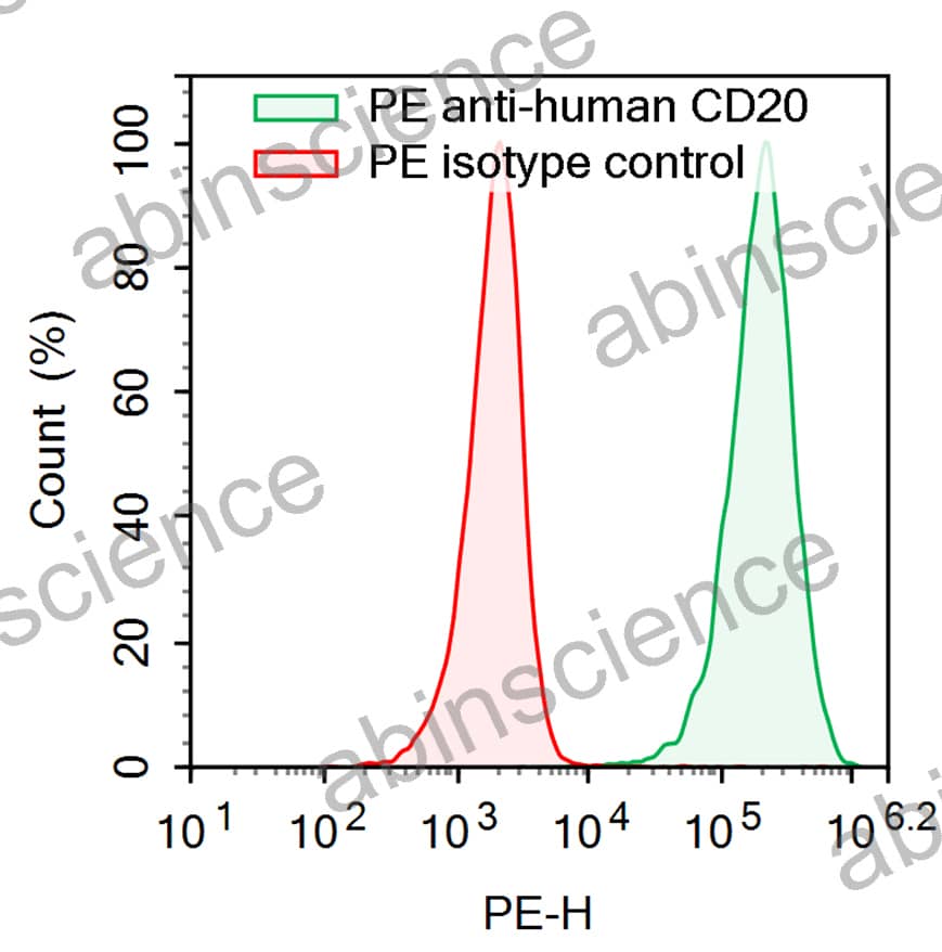 Flow-cytometry using PE anti-Human CD20 antibody. Daudi cells were stained with an irrelevant antibody (Red Histogram) or a PE anti-Human CD20 antibody monoclonal antibody (Catalog # HY257627 , Green Histogram) at a concentration of 5 µg/ml for 30 mins at RT. After washing, cells analysed on a NovoCyte Flow Cytometer. |
