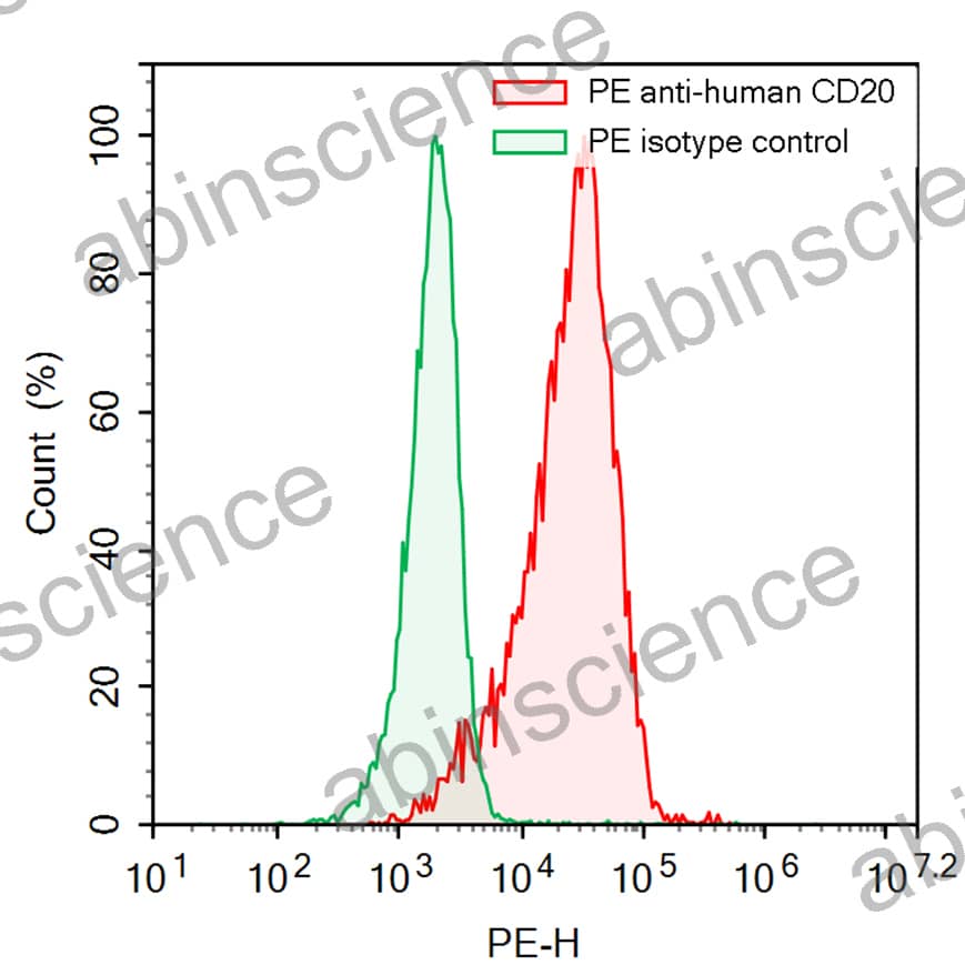 Flow-cytometry using PE anti-Human CD20 antibody. Daudi cells were stained with an irrelevant antibody (Green Histogram) or a PE anti-Human CD20 antibody monoclonal antibody (Catalog # HY257727 , Red Histogram) at a concentration of 5 µg/ml for 30 mins at RT. After washing, cells analysed on a NovoCyte Flow Cytometer. |