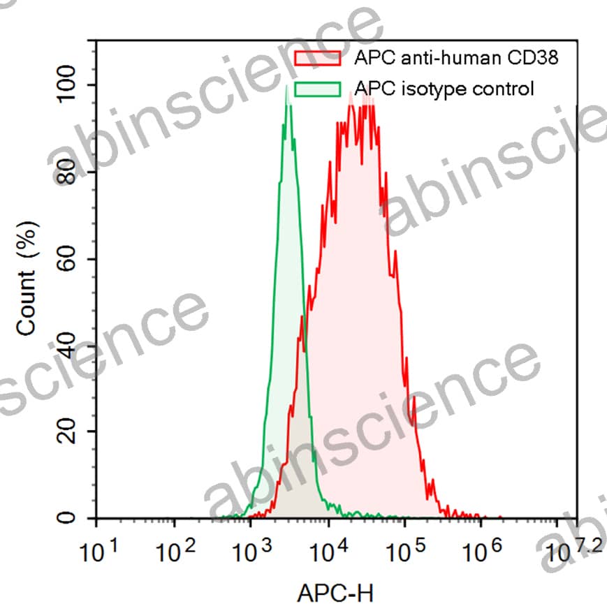 Flow-cytometry using APC anti-Human CD38 antibody. RPMI-8226 cells were stained with an irrelevant antibody (Green Histogram) or an APC anti-Human CD38 antibody monoclonal antibody (Catalog # HB691637 , Red Histogram) at a concentration of 5 µg/ml for 30 mins at RT. After washing, cells analysed on a NovoCyte Flow Cytometer. |