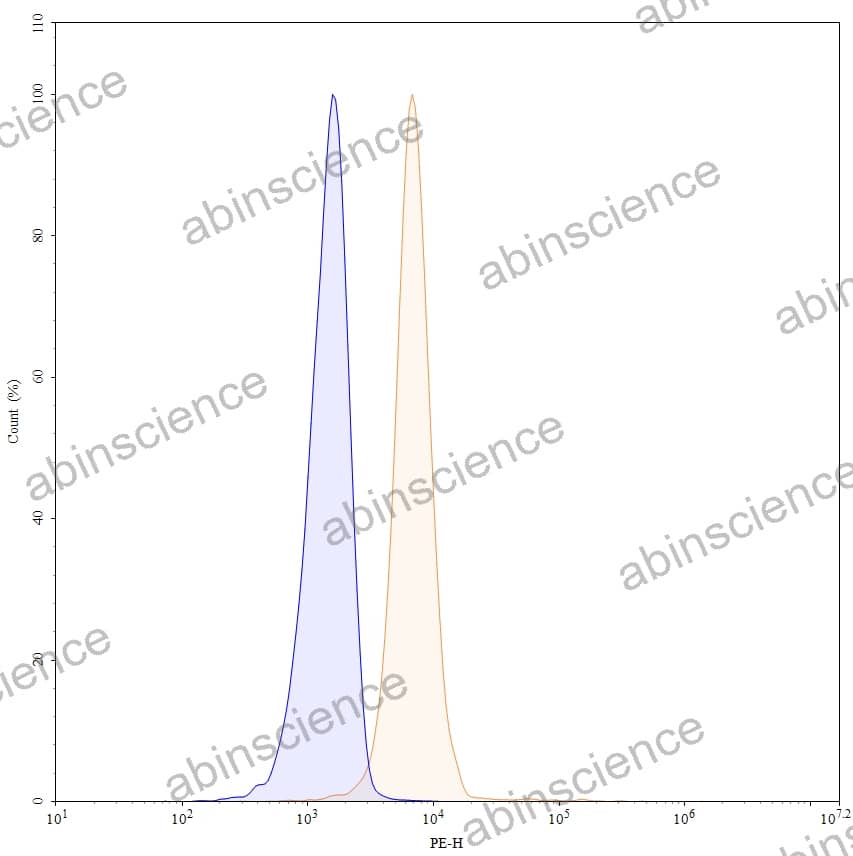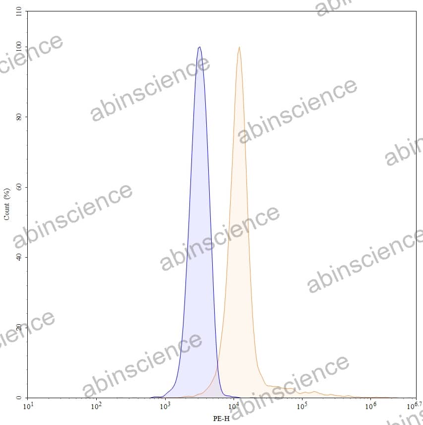 Flow-cytometry using PE anti-human FOXP3 antibody. Jurkat cells were fixed and permeabilized, then stained with an irrelevant antibody (Blue Histogram) or an PE anti-human FOXP3 monoclonal antibody (Catalog: HV388325, Yellow Histogram) at a concentration of 5 µg/ml for 30 mins at RT. After washing, cells analysed on a NovoCyte Flow Cytometer. |