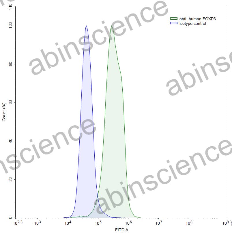 Flow-cytometry using anti-human FOXP3 antibody. Jurkat cells were stained with an irrelevant antibody (Blue Histogram) or an anti-human FOXP3 antibody monoclonal antibody (Catalog # HV388015, Green Histogram) at a concentration of 5 µg/ml for 30 mins at RT. After washing, bound antibody was detected using a FITC conjugated goat anti-mouse antibody (MF690414) and cells analysed on a NovoCyte Flow Cytometer.