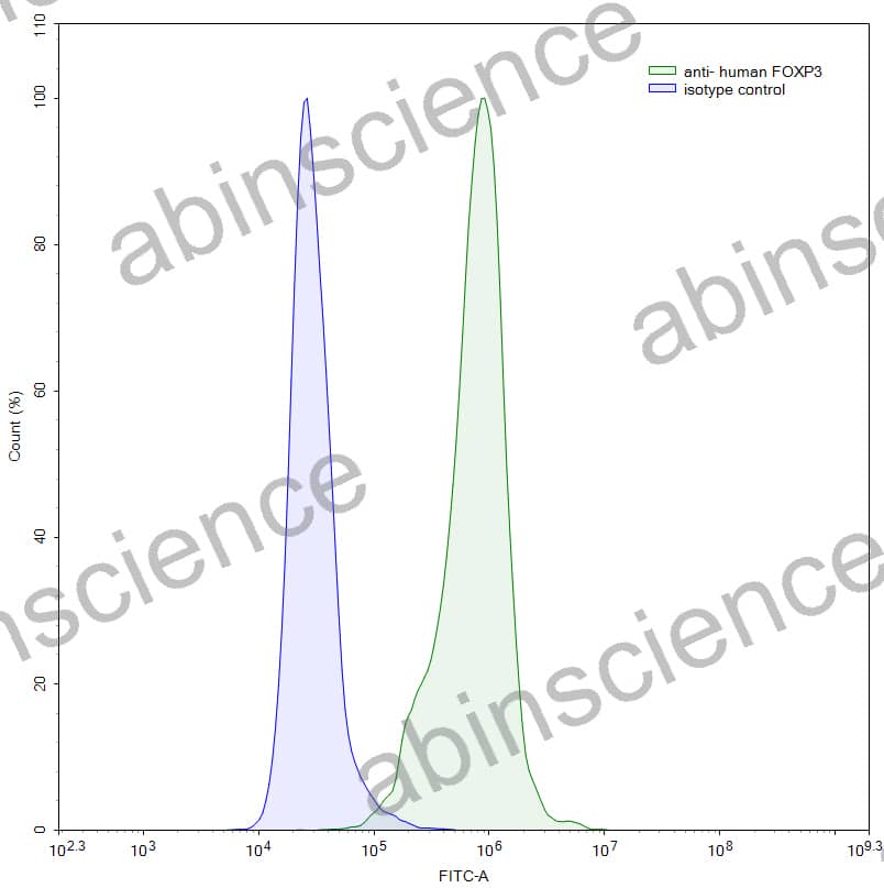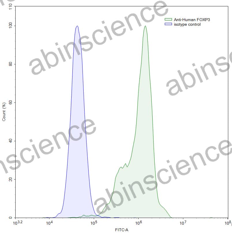 Flow-cytometry using anti-human FOXP3 antibody. Hela cells were stained with an irrelevant antibody (Blue Histogram) or an anti-human FOXP3 antibody monoclonal antibody (Catalog # HV388025, Green Histogram) at a concentration of 5 µg/ml for 30 mins at RT. After washing, bound antibody was detected using a FITC conjugated goat anti-mouse antibody (MF690414) and cells analysed on a NovoCyte Flow Cytometer.