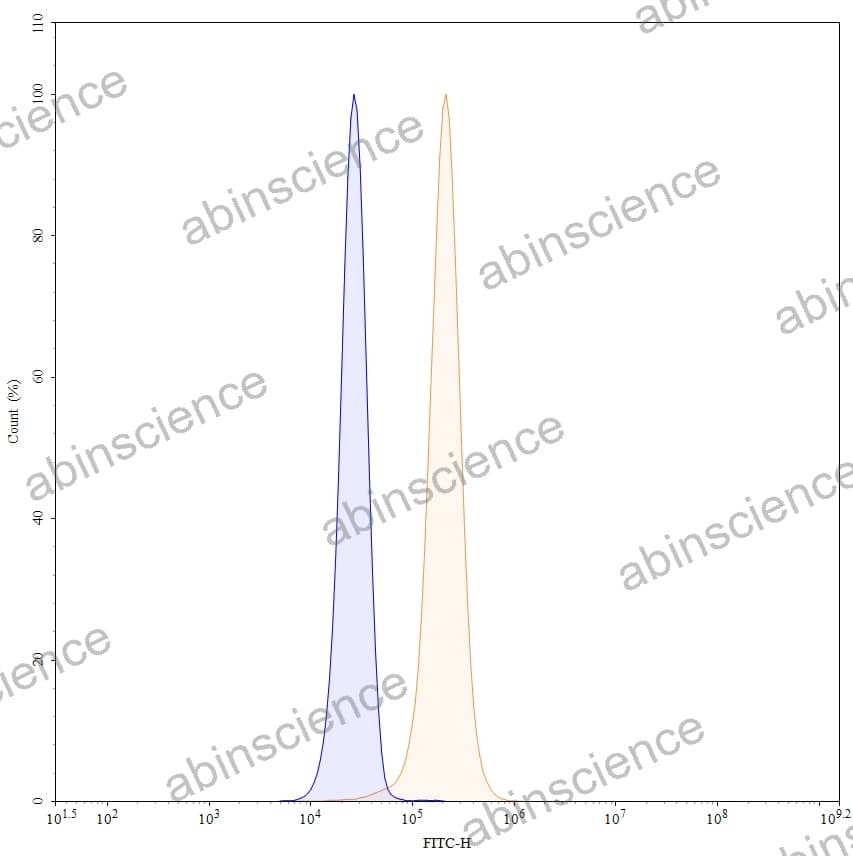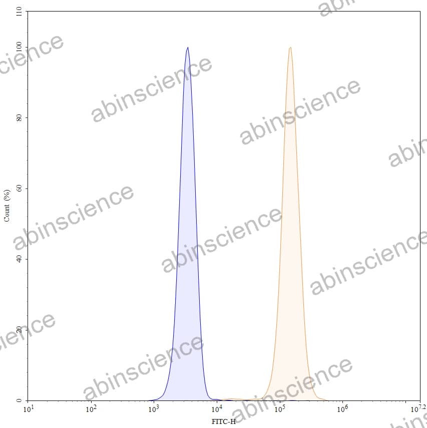 Flow-cytometry using anti-human FOXP3 antibody. Hela cells were fixed and permeabilized, then stained with an irrelevant antibody (Blue Histogram) or an anti-human FOXP3 monoclonal antibody (Catalog: HV388025, Yellow Histogram) at a concentration of 5 µg/ml for 30 mins at RT. After washing, bound antibody was detected using Goat Anti-Mouse IgG H&L Polyclonal Antibody, FITC (abinScience: MF690414) and cells analysed on a NovoCyte Flow Cytometer. |