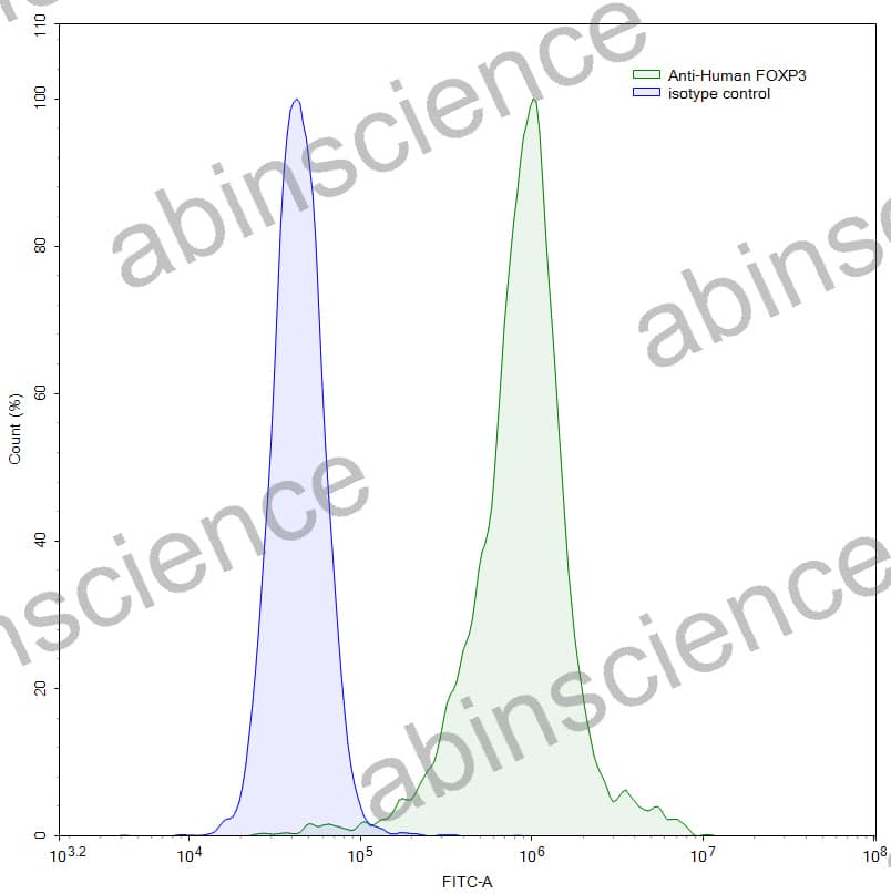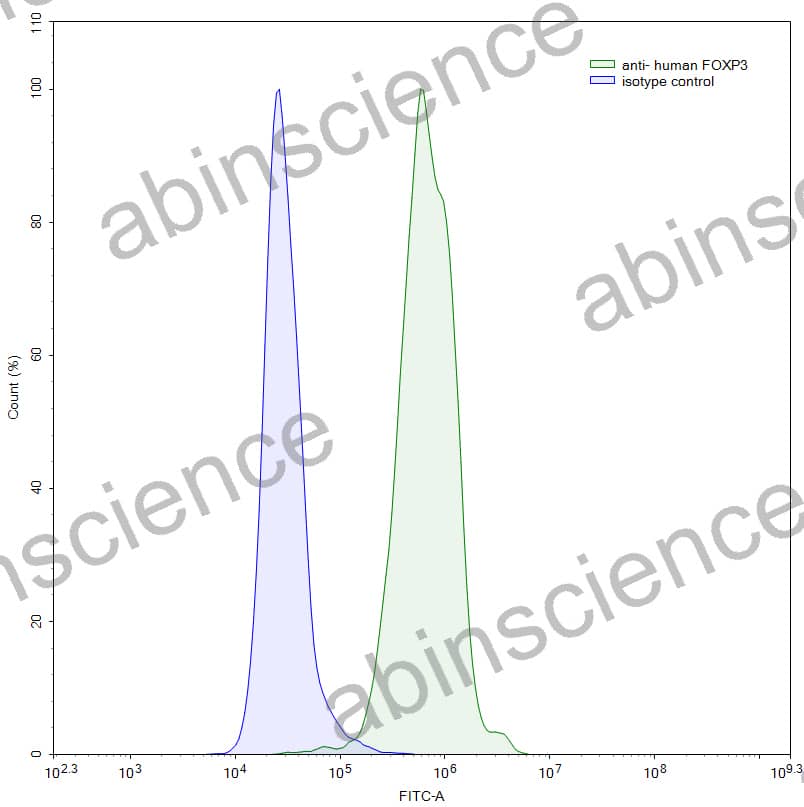 Flow-cytometry using anti-human FOXP3 antibody. Hela cells were stained with an irrelevant antibody (Blue Histogram) or an anti-human FOXP3 antibody monoclonal antibody (Catalog # HV388035, Green Histogram) at a concentration of 5 µg/ml for 30 mins at RT. After washing, bound antibody was detected using a FITC conjugated goat anti-mouse antibody (MF690414) and cells analysed on a NovoCyte Flow Cytometer.
