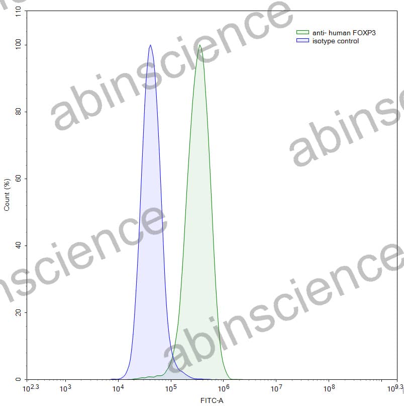 Flow-cytometry using anti-human FOXP3 antibody. Jurkat cells were stained with an irrelevant antibody (Blue Histogram) or an anti-human FOXP3 antibody monoclonal antibody (Catalog # HV388045, Green Histogram) at a concentration of 5 µg/ml for 30 mins at RT. After washing, bound antibody was detected using a FITC conjugated goat anti-mouse antibody (MF690414) and cells analysed on a NovoCyte Flow Cytometer.