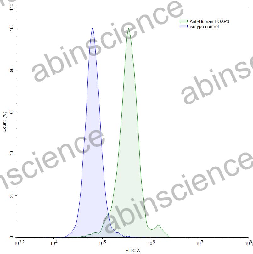 Flow-cytometry using anti-human FOXP3 antibody. Hela cells were stained with an irrelevant antibody (Blue Histogram) or an anti-human FOXP3 antibody monoclonal antibody (Catalog # HV388045, Green Histogram) at a concentration of 5 µg/ml for 30 mins at RT. After washing, bound antibody was detected using a FITC conjugated goat anti-mouse antibody (MF690414) and cells analysed on a NovoCyte Flow Cytometer.