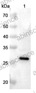 Western blot analysis was performed using anti-CA1QA polyclonal antibody at 1μg/ml on various samples. Lane 1: Human plasma lysate