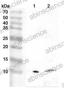 Western blot analysis was performed using anti-PF4 polyclonal antibody at 1ug/mL on various samples. Lane 1: Mouse spleen lysate Lane 2: Mouse heart lysate