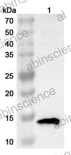 Western blot analysis was performed using anti-TFF1 polyclonal antibody at 1ug/mL on various samples. Lane 1: MCF-7 cell lysate