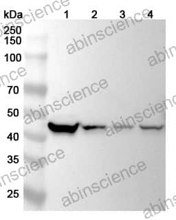 Western blot analysis was performed using anti-KRT18 polyclonal antibody at 1ug/mL on various samples. Lane 1: HT-29 cell lysate Lane 2: Hela cell lysate Lane 3: A431 cell lysate Lane 4: K562 cell lysate